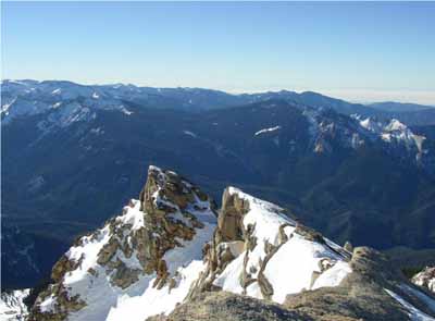 The summit register notebooks were wrapped in ziplocks, but apparently water had still gotten in and frozen the pages together, which was too bad. Views were fantastic, weather was perfect - sunny, cloudless, not even breezy.