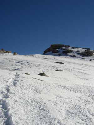 Descending, I thought about a glissade, but it was only about 10am and the snowpack seemed like it might be a bit too hard, and was a little thin - lots of rocks, so just walked down.