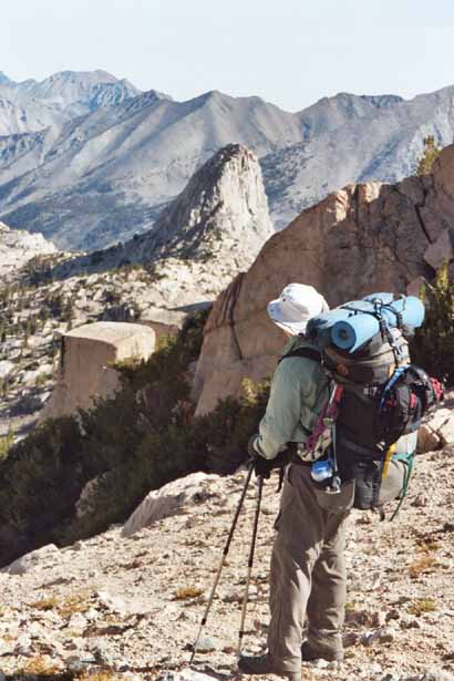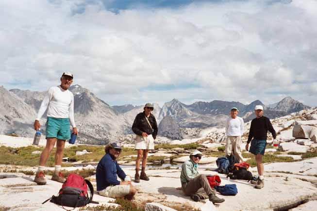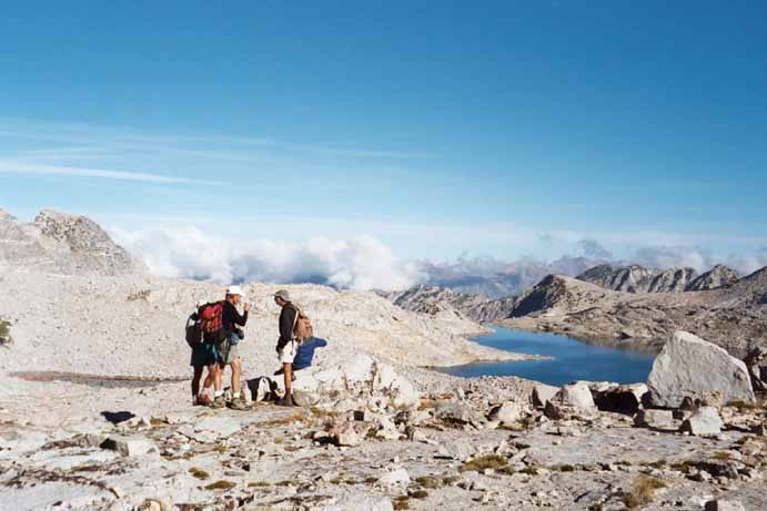 Sunday August 22nd. We are all moving at 7:00 a.m. and reach Glen Pass at 8:00 a.m. where we get our first view of the beautiful 60 Lakes and Rae Lakes basins. As we make our way down from the pass and towards Rae Col we run into Brian who is camped at one of the lakes just north of the pass (we had given up on him at Glen Pass). He had passed through our previous night's camp during the storm and none of us (who were all warm and snug in our tents) could hear his shouts as he passed through. He figured that we had pushed ahead and had gone over the pass in hopes of finding us there. Now with all trip participants aboard, we head over Rae Col and down to our camp for the next 3 nights - a small lake SW of Fin Dome.