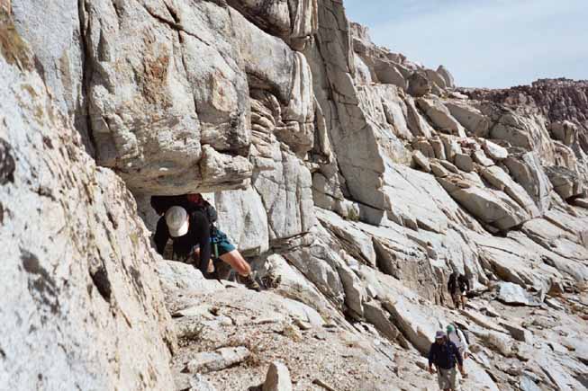 Monday, August 23rd. We get a 6:30 a.m. start for our attempt of Mt. Clarence King. Even though we didn't get any rain yesterday, the constant flow of clouds from the northwest causes us to keep an eye on the weather all day. From our camp we follow the trail down into the basin for about 1 mile to a location just past Point 3361 and where Clarence King comes back into view. From here, we leave the trail and work our way up to the large lake that is east of Clarence King (roughly following the drainage). We now must find a way to get from this lake up through the cliffs that lead to the south slope of the peak (due west of the lake). Fortunately, everyone in our group (except Joe and I) had been here before and knew the way. Near the top right side (climbers right) of the cliff, there is a ramp that leads slightly up and to the left. A large overhanging boulder near the start (which we had to crawl under) will help to identify the correct ramp. Once we are on the south slope it is a straightforward traverse and climb to a point ~150 ft below the summit this is where the real climbing begins.