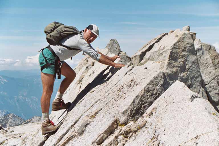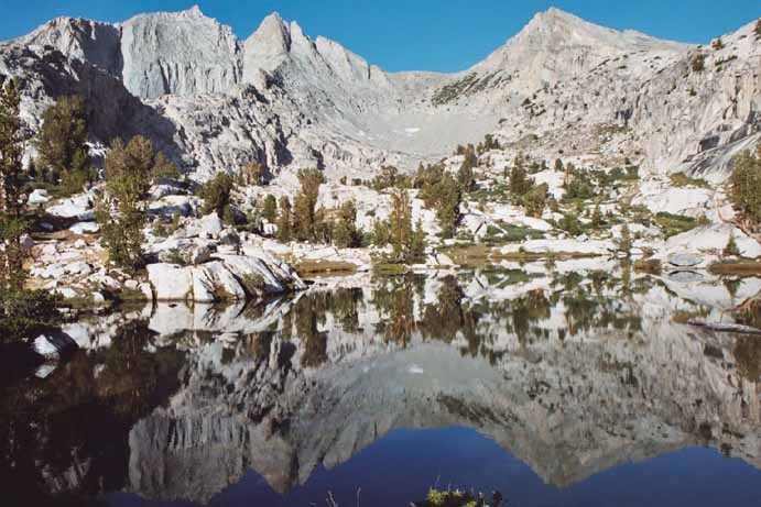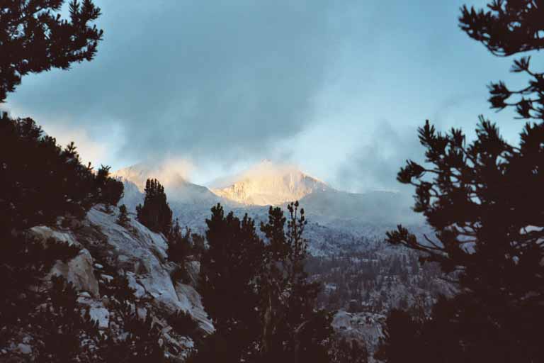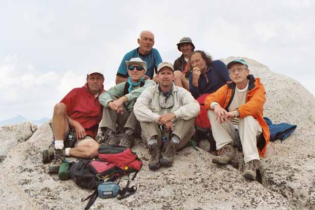 When Joe White and I started planning this trip, we envisioned a week in the Sierra that would have a little something for everyone who joined us: Challenging climbing, a chance to hike a section of the John Muir Trail, (JMT), and a visit to one of the most scenic areas in the Sierra. After a week that started with rain, hail, lightning, and fog only to ease up and allow enjoyable climbing on some great routes, combined with good companionship, big horn sheep sightings, backpacking through a section of the JMT, and a trailhead encounter with the biker in the pink miniskirt, we were not disappointed.