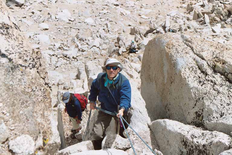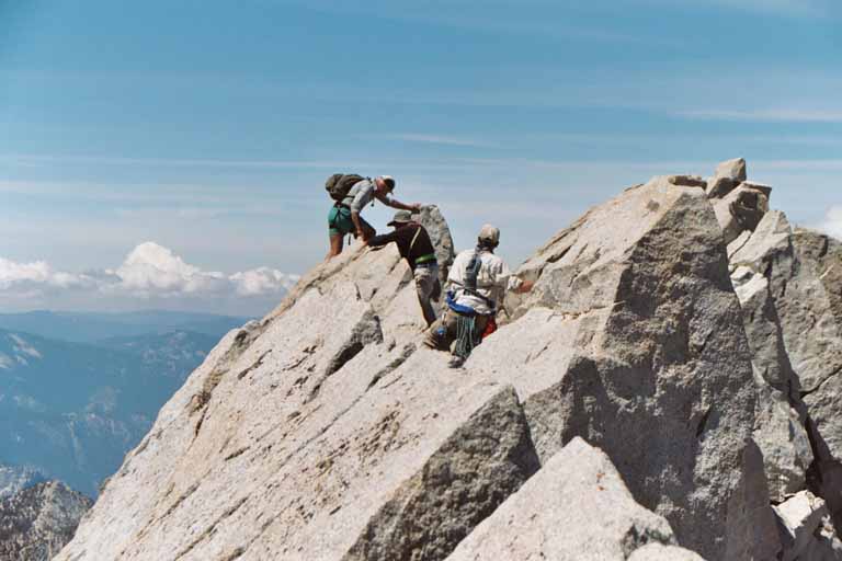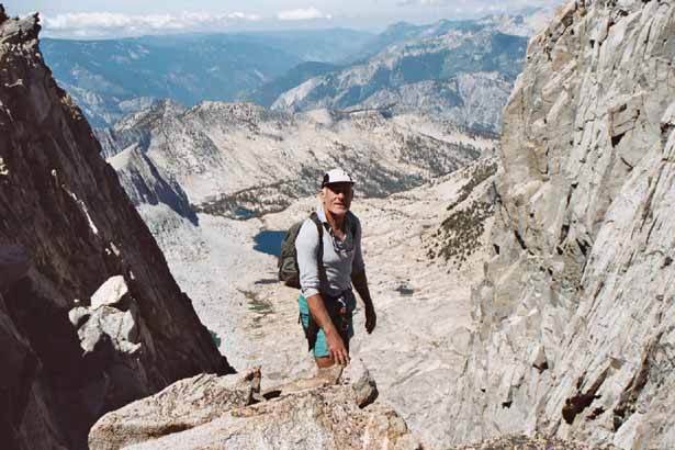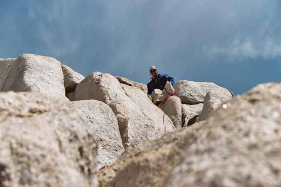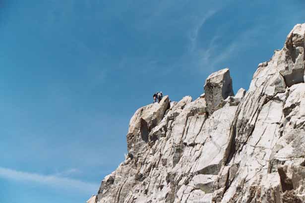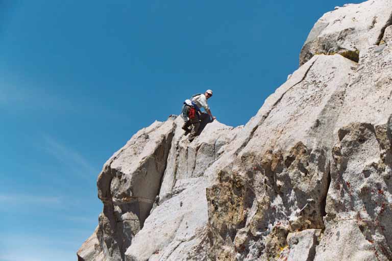 Tuesday, August 24th. After saying our goodbyes to Brian (he has to return home for work), we are again moving at 6:30 a.m. And after two days of climbing, we are all a little tired. In fact, by the time we reach 60 Lakes Col, 2 of our climbing compadres have decided to pass on climbing Mt. Gardiner and simply enjoy the day exploring the area. This leaves four of us for an attempt of Mt. Gardiner. Our plan for the climb is to go over 60 Lakes Col into Gardiner Basin and then head up the east chute/ridge to the final summit ridge. On our way up to 60 lakes Col, we are treated to a rare encounter with 7 Sierra Nevada Big Horn Sheep! Once up to the col, we work our way down through some large boulders to the lakes at the south end of Gardiner Basin. From here we survey the east chute and try to pick out a route that will avoid scree as much as possible. As we head up we find that most (but not all) of the loose stuff can be avoided by staying closer to the east ridge. We reach the top of the chute, and after some delicate class 3 climbing find ourselves on the south summit staring at the obvious crux of the climb a vertical traverse of several hundred feet to the actual summit.