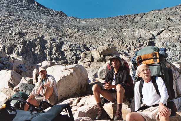 Thursday August 26th. We break camp using headlamps and are hiking towards Pinchot Pass at 6:00 a.m. It's a cool morning (below 30 F) and we are moving quickly to stay warm. In our haste, we almost miss the group of 6-7 big horn sheep that are grazing just south of the pass. The pass is colder and windier than our camp was so we keep moving until we reach a warm and sunny break spot a little north of Lake Marjorie. From here we make it easily to Taboose Pass and then start the punishing descent to the trailhead. Fortunately, the weather stays relatively cool (high 80's) all the way to the 5,400 ft trailhead that we reach before 2:00 p.m. After a quick shower, we pick up Joe's car at the Wilder House and head home.