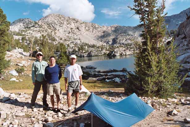 Saturday August 21st. Everybody is up, packed and ready to start moving by 7:45 a.m. Before leaving, we meet Brian Smith, the 6th member of our group. He had arrived at the trailhead at 5:00 a.m. and decides that he needs a little more sleep before hiking in and meeting up with us in camp later that evening. We have a pleasant and unhurried hike into our camp which we strategically choose near a small tarn just south of Glen Pass. Our thinking is that it made no sense to hump all the way over Glen Pass on day 1 since the next day's hiking and climbing objectives were moderate (3-4 mile backpack and an afternoon attempt of Fin Dome). As we are setting up our tents, R.J. Secor, the 7th and final member of our group, wanders into camp. He has come in from the west side and spent some time climbing around Charlotte Lake. Once our tents are up, it rains like hell for about 2 hours. Mixed in with the rain is plenty of hail and lightning. Things finally calm down around 6:00 p.m. and we are able to emerge from our shelters and cook dinner. By the time we all get to bed, Brian has not showed up we figure that he is camped nearby or still sleeping at the trailhead.