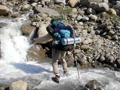 With two poles and without my pack, I was just barely able to cross. Not crossing was not an option as all of the little streams that we had just previously crossed had merged into an obviously uncrossable stream just downstream from our position on the gravel bar. I hurried downstream as fast as I could watching for him - hoping he was clinging to a rock. After 1/2 km-it must have taken me 10 minutes to get there, I saw his pack, praying that he wasn't with it. I was near panic now. I recall ignoring rapids and stepping in chest deep holes in the stream to reach him.
