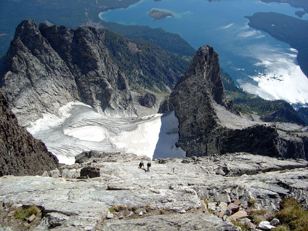 Before I set off after Alan I switched back to my rock climbing shoes. Essentially we were downclimbing the traverse below Unsoeld's Needle we had made that morning. Alan followed the exact path we had come up and after he'd made it about two thirds of the way across he radioed back that this was probably not the best way. He recommended the rest of us traverse below. I found my way to the notch that we had crossed during the first pitch this morning and instead of staying high across the slabs I traversed down below them. The terrain I found below was more fairly steep slabs broken by the occasional ledge. The exposure wasn't terrific, but it got your attention just the same. If you fell you probably wouldn't fall all the way down to the glacier, but I didn't want to find out either. I made careful progress traversing steep slabs and narrow ledges toward Drizzlepuss. After a while I saw Alan downclimbing near the end of the traverse so that his route intersected my own - I knew I was on the right track. I watched Alan climb up a short steep slab and he was in the notch. I looked back to make sure Barry and Eric could see the route I had taken and assured them that it would go. I turned back toward the notch and finished the traverse to join Alan. Eric and Barry showed up shortly afterward.