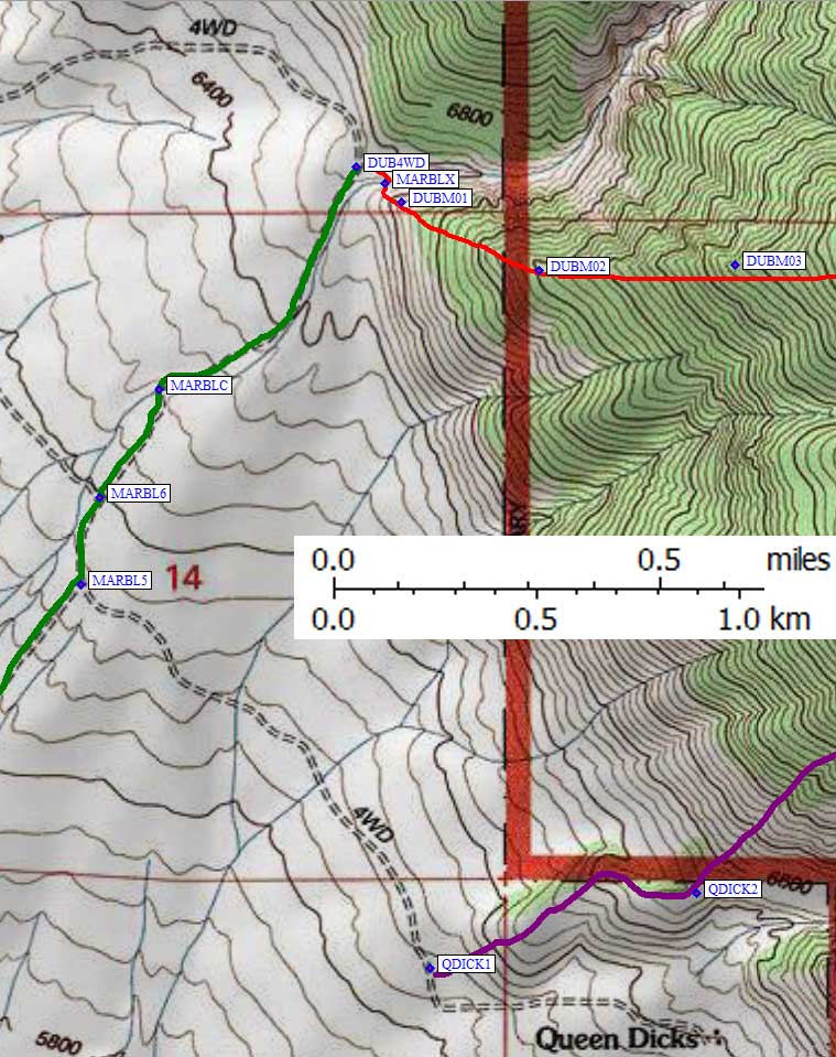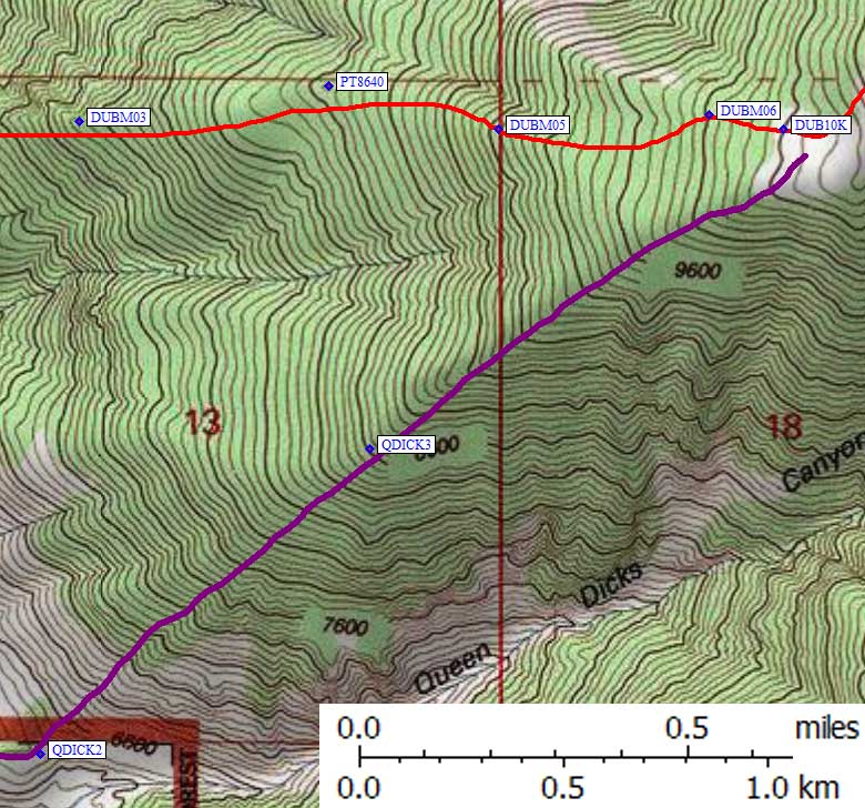 The ridge is mostly reasonable walking, with a few rocky sections that require a traverse below the ridgeline on the south side. The main rocky section tops out at 7.9k (waypoint DUBM03), above which is some of the nicest walking of the trip. There are also a few brushy patches, but nothing that tore our clothes or made us crawl under (as I've done on some other DPS peaks). The top of one brush patch is at 9.2k (waypoint DUBM05), the top of the other brush patch is at 9.8k (waypoint DUBM06). It's easy to split up here, and on the way down it would be easy to mistakenly drift off the proper ridge.