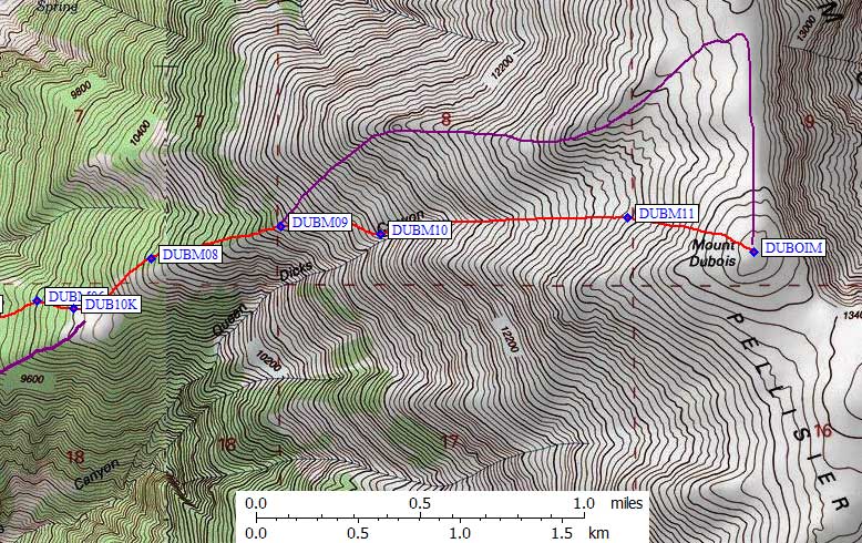 I took slightly different routes up and down, and I think the best line is to stay on the ridge until just over 11k (waypoint DUBM09), then traverse sharply into the drainage as the ridge melts away (waypoint DUBM10). Avoid the west ridge of Dubois, it's rocky! Stay in the bowl heading east until 13k (waypoint DUBM11), then drift a bit south to the summit itself. There are several candidate summit piles since the area is fairly flat.